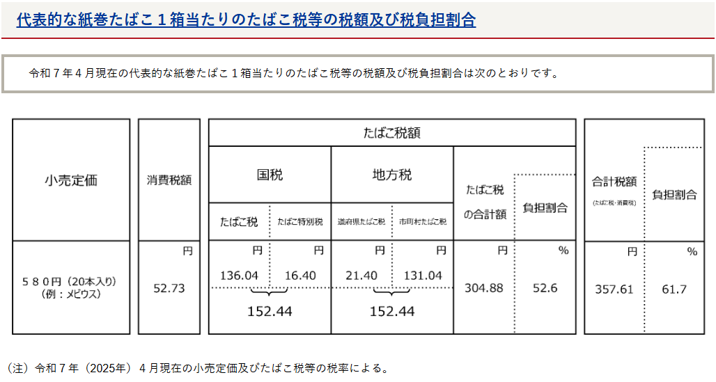 代表的なたばこ1箱あたり580円のうち、消費税とたばこ税合わせた合計税額は357.61円、負担割合は61.7%でした。