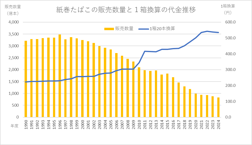 上のグラフは、一般社団法人日本たばこ協会の統計データ「年度別販売実績」をグラフ化したものです。