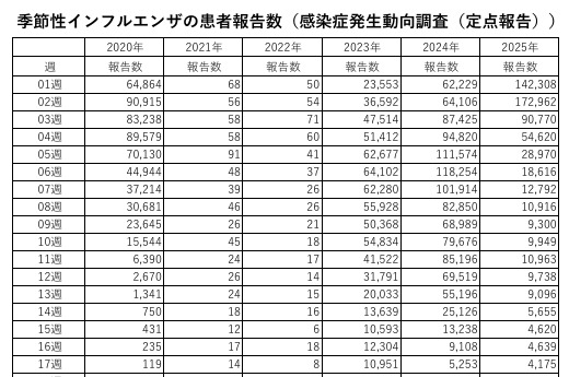例年であれば年末から翌年2月ぐらいにかけてピークとなるわけですが、2025年の第一週は10万人超でした。2024年の年末最終週(第52週)報告数は約30万人でした。