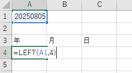 「年」は左から4ケタの位置にあるので、ここは「LEFT関数」で取り出すことができます。