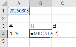 「月」は右(RIGHT)からも左(LEFT)からもアプローチできないので、ここは「MID関数」を使います。