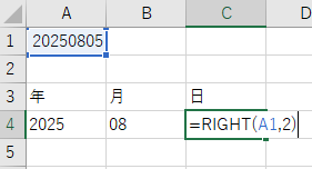 「日」は右から2ケタの位置にあるので、ここは「RIGHT関数」で取り出します。